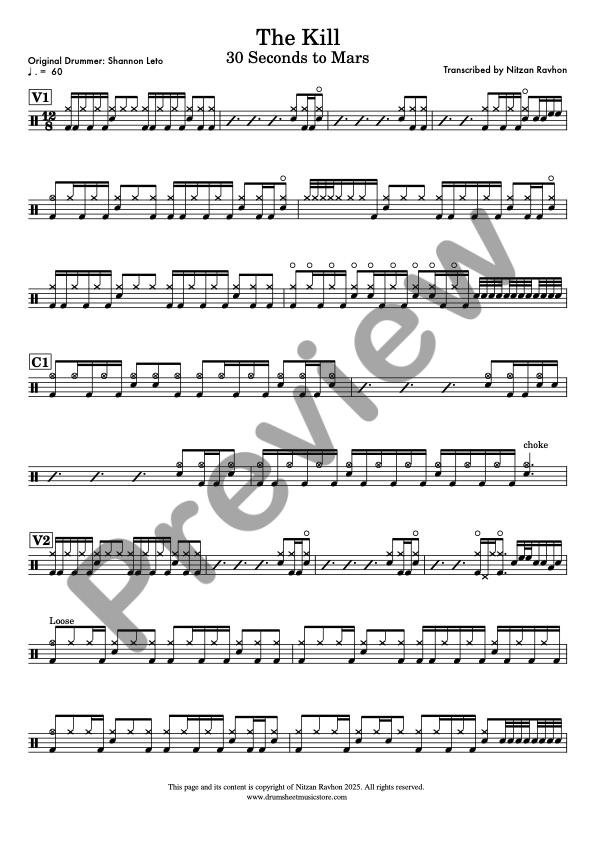 Note for note accurate drum sheet music of 30 Seconds to Mars – The Kill